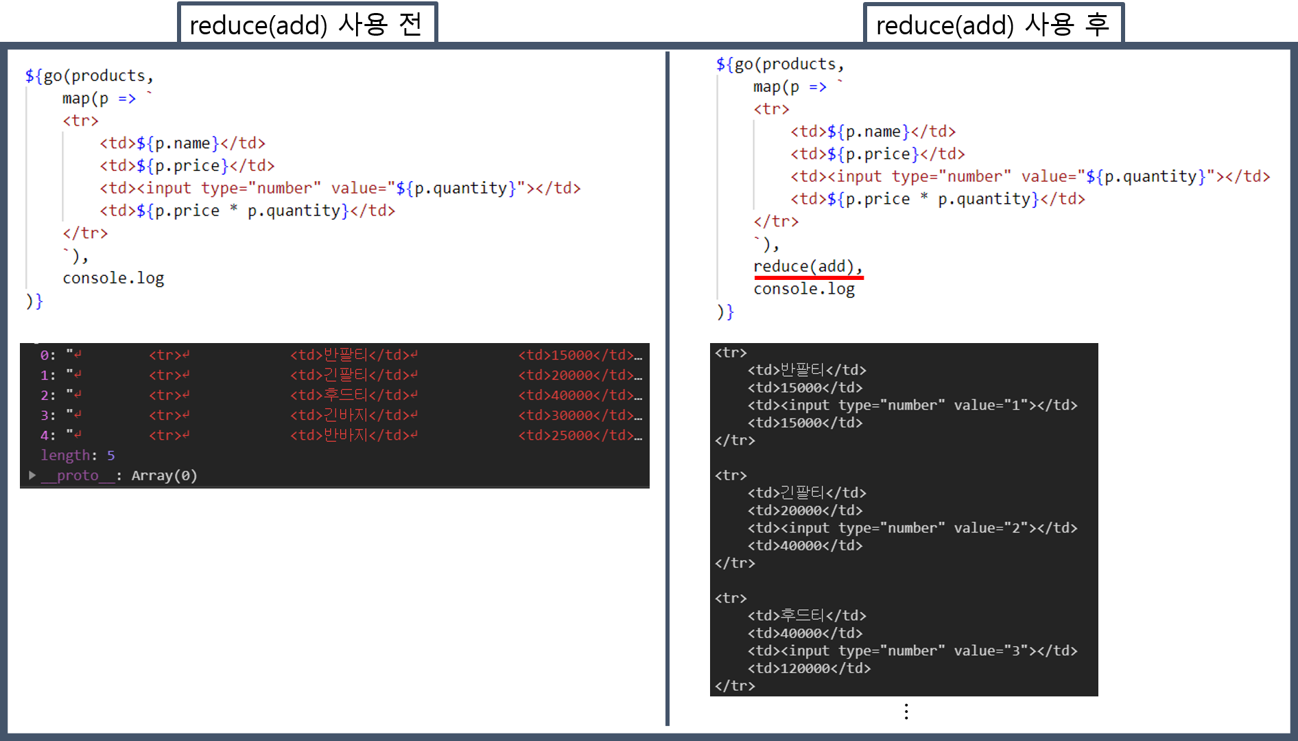 해결방법은 문자열 더하기를 통해 array가 아닌 하나의 값으로 만들어 줘야 한다. reduce로 array를 하나의 문자로 합쳐주면 되는데, 아래에서 reduce(add) 함수의 사용 전과 사용 후의 콘솔 출력을 비교해보자.